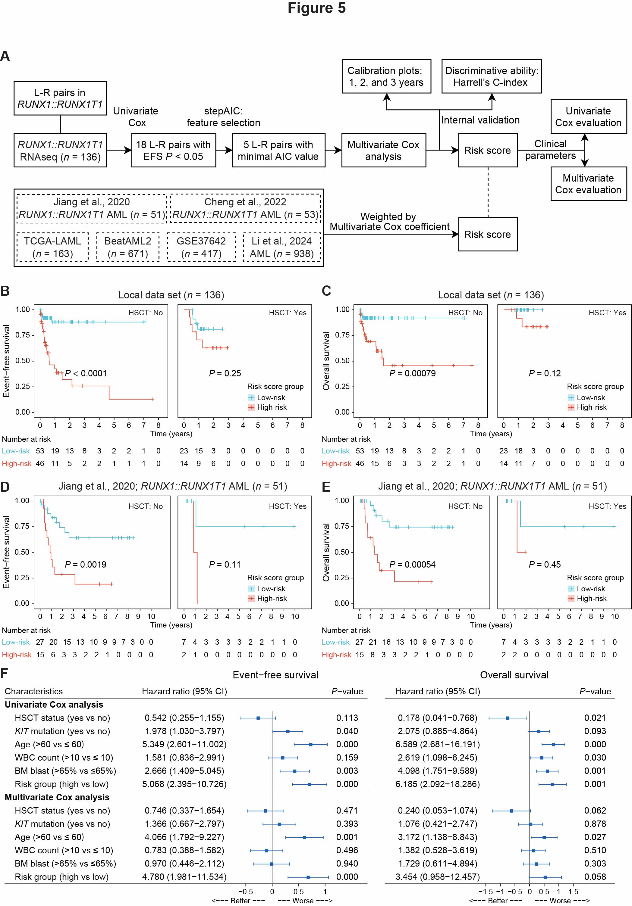 (A) Workflow diagram illustrating the process for generating RUNX1::RUNX1T1 AML-specific L-R pair risk scores and their validation using publicly available datasets. (B-C) Kaplan–Meier curve for EFS (B) and OS (C) stratified by HSCT status, based on risk score groups in 136 local RUNX1::RUNX1T1 AML cases. P-value was calculated using the log-rank test. (D-E) Kaplan–Meier curve for EFS (D) and OS (E) stratified by HSCT status, based on risk score groups in the external validation dataset by Jiang et al. (51 RUNX1::RUNX1T1 AML cases, non-overlapping with our local dataset). P-value was calculated using the log-rank test. (F) Forest plot of univariate and multivariate Cox regression analyses incorporating traditional clinical parameters and risk score groups. Hazard ratios and 95% CIs are displayed alongside each variable, with the x-axis on a \(log_{10}\)(HR) scale. In the forest plot, HRs are represented by boxes, while horizontal lines depict the 95% CIs. The vertical line at \(log_{10}\)(HR) = 0 (HR = 1) indicates no statistically significant effect, while values to the right of this line (HR > 1) suggest worse outcomes. P-values were calculated using the Wald test.