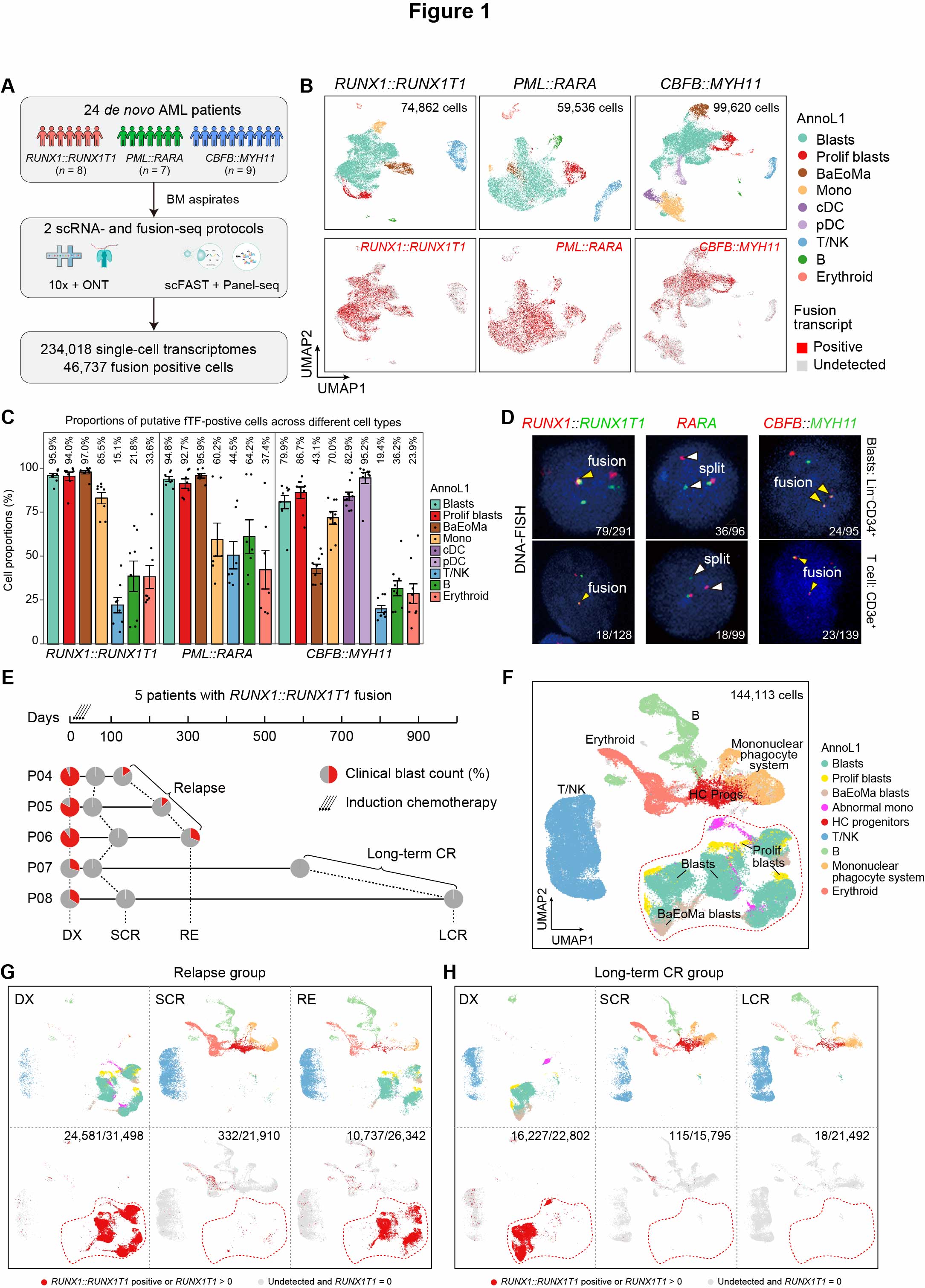 (A) Schematic representation of the study design. (B) Top panel: UMAP visualization of nine broad cell types from various AML subtypes. Colors indicate major cell types. Bottom panel: UMAP visualization of cells expressing RUNX1::RUNX1T1, PML::RARA, or CBFB::MYH11, where red and grey dots indicate fusion transcript-positive and fusion transcript undetected cells, respectively. (C) Percentage of putative fTF+ cells (defined by either direct fTF transcript detection or aberrant gene expression signature) in each major cell type across the RUNX1::RUNX1T1 (left), PML::RARA (middle), and CBFB::MYH11 (right) AML subtypes. Data are presented as mean ± standard error of mean (SEM). (D) Representative DNA-FISH confocal images. Dual probes detect RUNX1::RUNX1T1 and CBFB::MYH11 (yellow arrowheads indicate fusion genes), while split probes identify PML::RARA (white arrowheads indicate the split of two RARA gene portions). Leukemic blasts and T cells were sorted as follows: Lin-CD34+CD117+ for RUNX1::RUNX1T1 and CBFB::MYH11 blasts, Lin-CD34-CD117+ for PML::RARA blast; CD3e+ for T lymphocytes in all AML subtypes. (E) Overview of serially collected BM aspirates from five RUNX1::RUNX1T1 AML patients. Pie charts illustrate the clinical blast count for each sample. (F) UMAP visualization of nine broad cell types from RUNX1::RUNX1T1 AML longitudinal samples. Grey indicates low-quality cells. The red dashed box outlines the blast population. (G-H) Top panel: UMAP distribution of the RUNX1::RUNX1T1 AML relapse group (G) and long-term CR group (H) at different stages, with cell types color-coded based on panel F annotations. Bottom panel: UMAP plots showing cells expressing RUNX1::RUNX1T1 or truncated RUNX1T expression > 0 at these stages, highlighting the distribution of fusion transcript-positive cells in the relapse group (G) and long-term CR group (H). Red dots indicate RUNX1::RUNX1T1+ cells or those with RUNX1T1 expression > 0; grey dots represent cells with no fusion transcripts and RUNX1T1 expression = 0. The number before the slash indicates putative fTF+ cells, and the number after the slash denotes the total cell count. Low-quality cells were excluded for clarity.